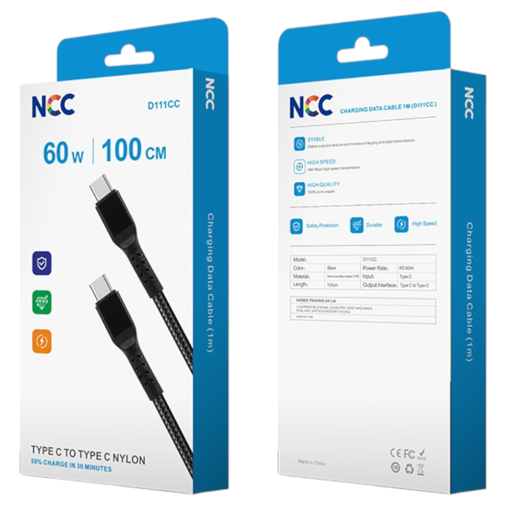 Charging Sync Cable NCC USB-C TO USB-C (1M|60W|D111CL) Nylon, black (Retail/Blister)